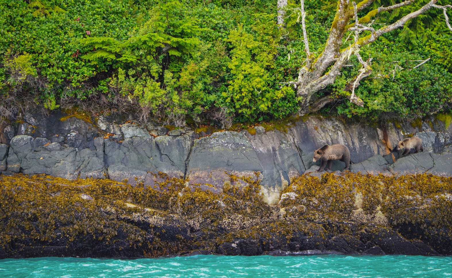 Brown bear sow and cub walking the shores of Knight Inlet, British Columbia.