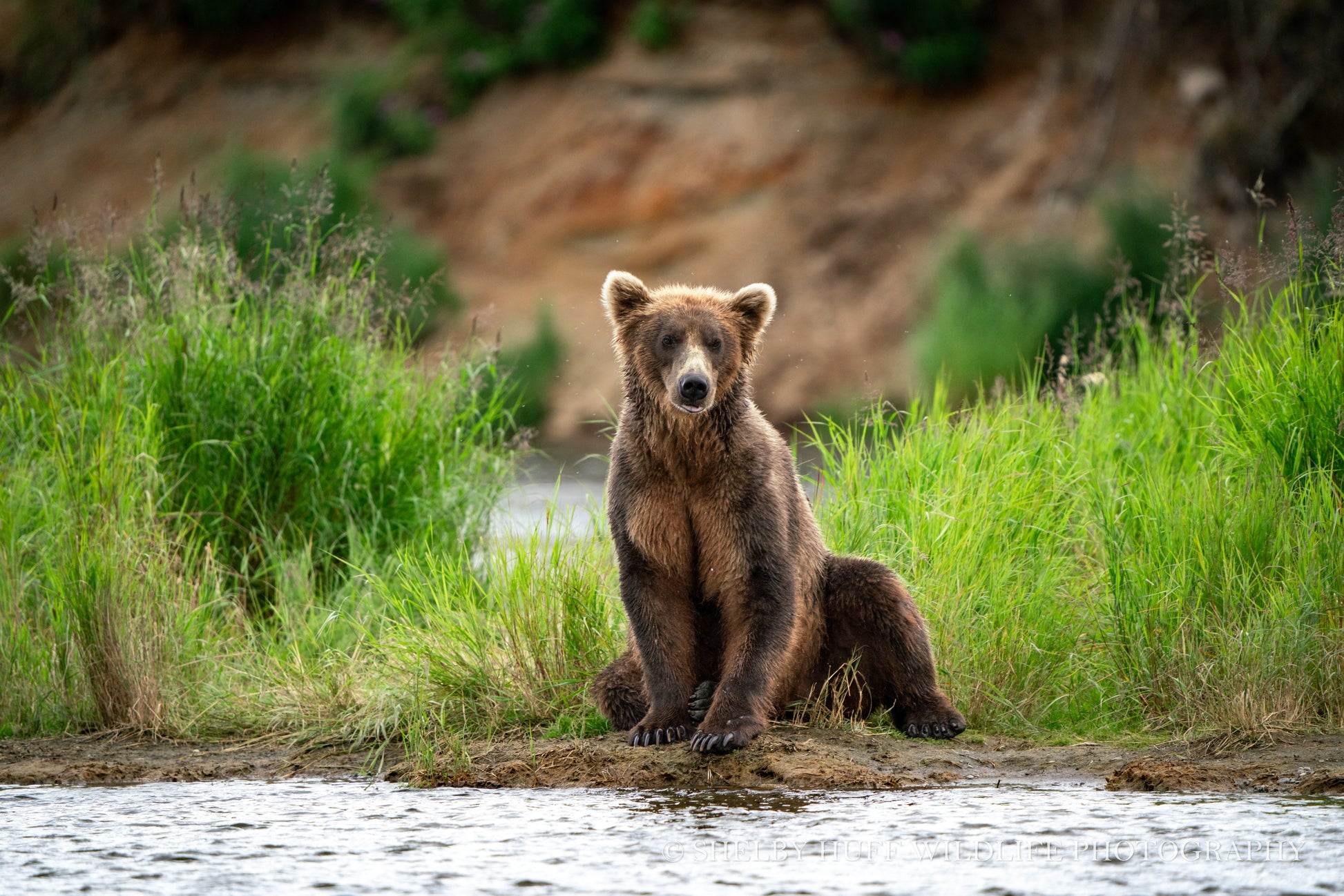 Brown bear waiting on salmon in Katmai National Park, Alaska.