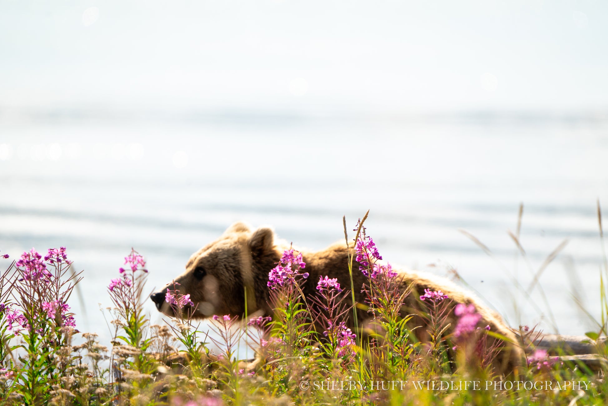 Brown bear in fireweed in Katmai National Park, Alaska.