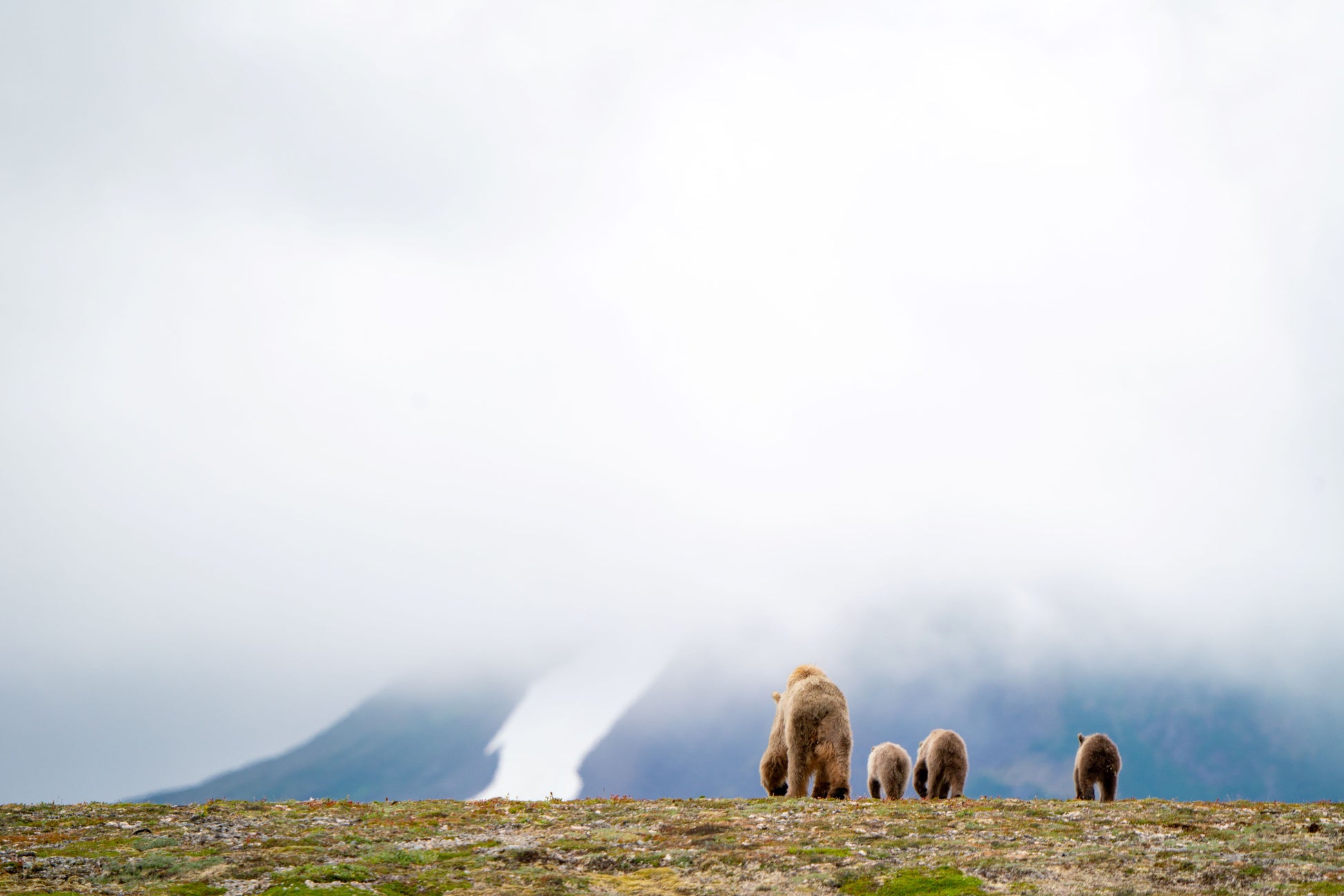 Brown bear sow and three cubs crest the hill in Katmai National Park, Alaska.